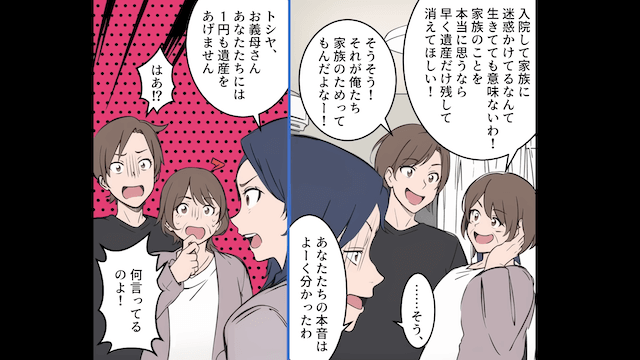 夫は遺産が手に入るからと浪費を始め、義母も遺産の存在を知って豹変しました。 そして夫と義母は父が早くいなくなることを望み、ひどい発言を繰り返したのです。