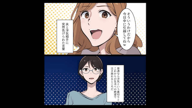 今回は『幼なじみの女と再婚した夫「お前とは離婚だ!出てけ!」幼なじみ「今日中に引越してね(笑)」⇒快く新居に引越した結果』を紹介します。 幼なじみと浮気した夫に、離婚を突きつけられた主人公。 しかし主人公は余裕の表情で「じゃあ出ていくわね」と告げ…。