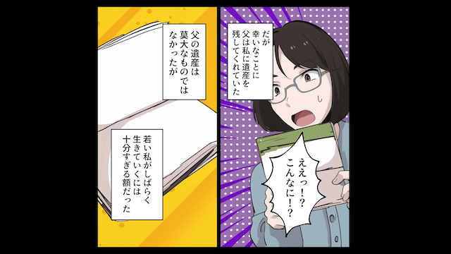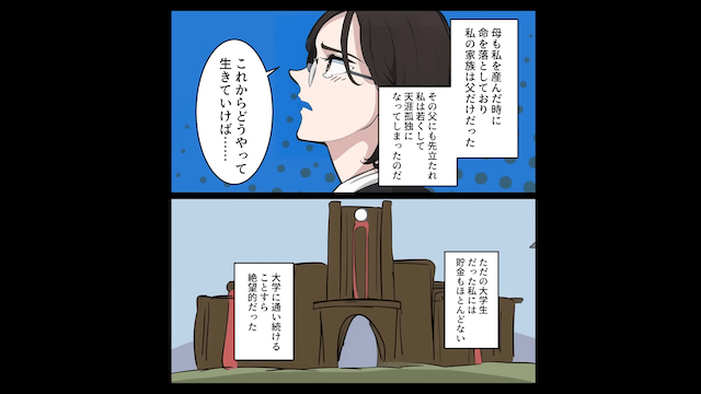 大学生のときに父を亡くし、天涯孤独になってしまった主人公は、大学に通うことすら絶望的な状況に。 しかし父が遺産を残してくれたことで、生きていくには十分なお金を手に入れたのでした。
