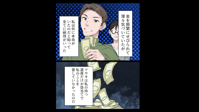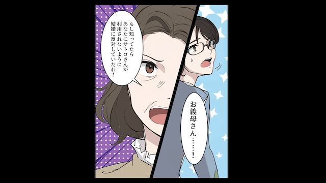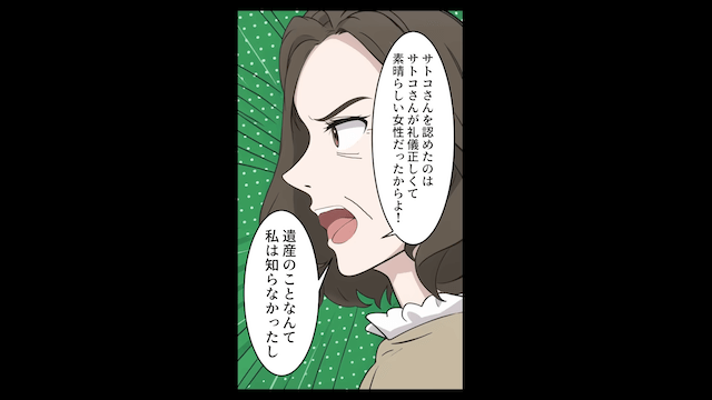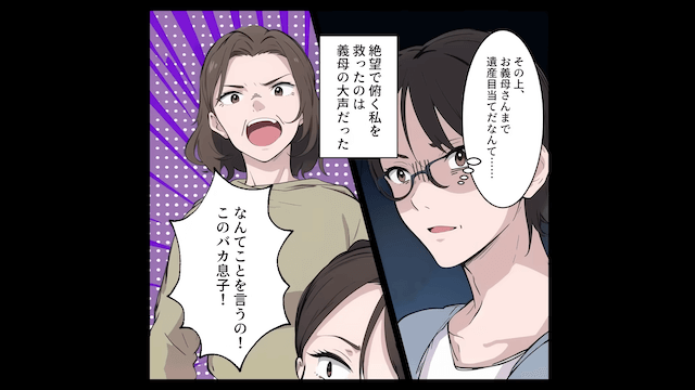 家族であることを強調されて主人公が夫に反論できずにいると、義母が夫を叱ってくれました。 夫はそんな義母に逆ギレし「母さんこそ遺産目当てで結婚を認めたんじゃないのか」と叫びます。