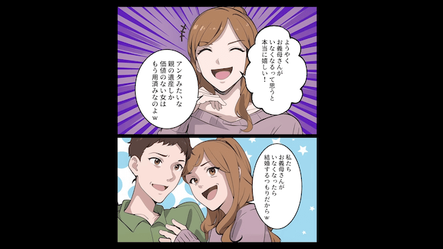 主人公が全力で義母を支えていたある日、夫が幼なじみを連れて病院にやってきました。 そして夫が幼なじみとの浮気を明かしたため、主人公はショックを受けたのです。