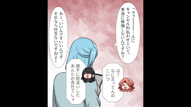 さらに先輩たちがキャンセル料の支払いも押しつけてきたため、主人公は「本当に後悔しないんですね?」と確認をして…。