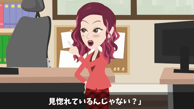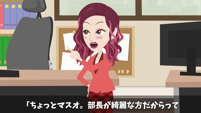 同僚は「部長がきれいな方だからって見惚れているんじゃない?」と主人公に言いました。 すると主人公は「え?あ、そ、そんなこと…!」と慌てて否定し…。