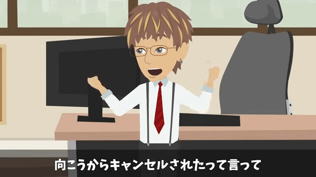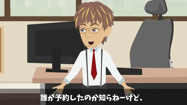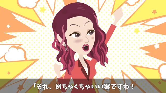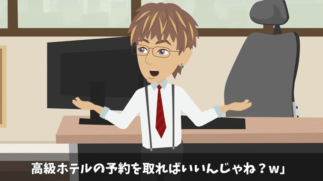 上司は主人公の旅館をキャンセルして、ホテルの予約を取ろうと同僚に話します。 それを聞いた同僚は「それ、めちゃくちゃいい案ですね!」と嬉しそうに言いました。