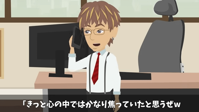 上司が電話を終えると、同僚が「どうでしたどうでした?あいつ、焦ってましたか?」と聞いてきました。 それに対し上司は「きっと心の中ではかなり焦っていたと思うぜ」と答えます。
