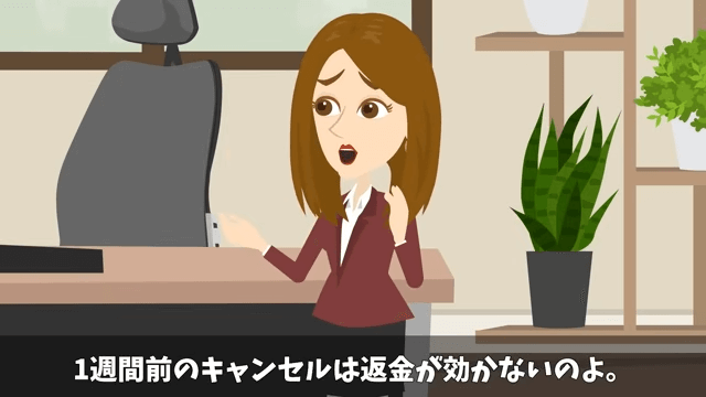 部長は「料金はすでに払ってあるのにキャンセルって…本当にそんな連絡が来たの?」と上司に尋ねます。 そして部長は、いかなる理由でも1週間前のキャンセルは返金できないことを上司に説明しました。
