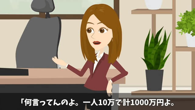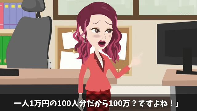 部長は旅館の料金が1人10万円で合計1000万円であることを上司に伝えます。 それを聞いた同僚は「1人1万円の100人分だから100万?ですよね」と部長に尋ねますが、部長は「何言ってんのよ。1人10万で計1000万円よ」と言い…。