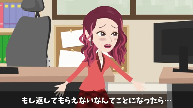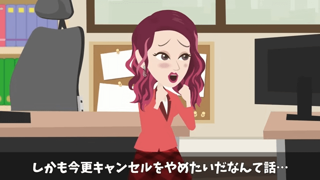 話を聞いていた同僚は「大丈夫なんですか!?」と上司を心配しました。 さらに同僚は「いまさらキャンセルをやめたいだなんて話…本当に上手くいくんですか…」と上司に言います。