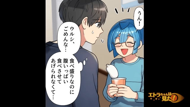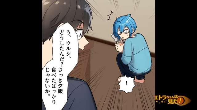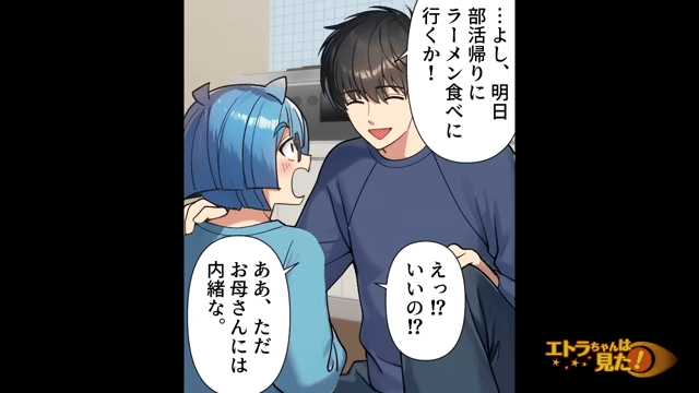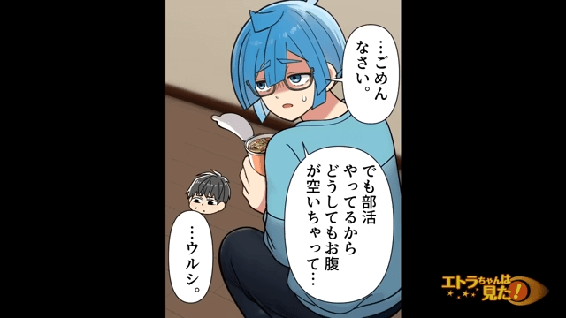 隠れてカップ麺を食べている息子を見て主人公が驚くと、息子は「…ごめんなさい。でも部活やってるからどうしてもお腹が空いちゃって…」と言いました。 そこで主人公は、息子に「明日部活帰りにラーメン食べに行くか!」と言ったのです。