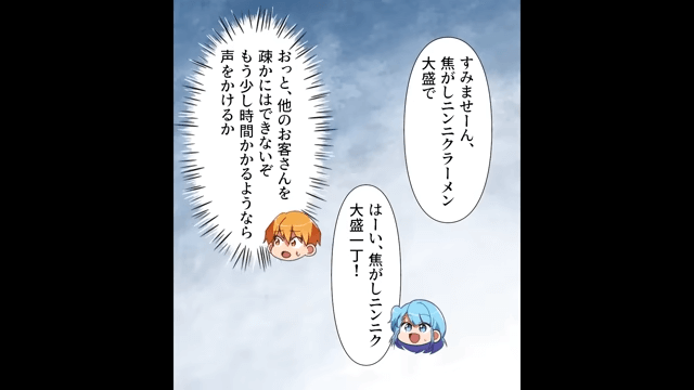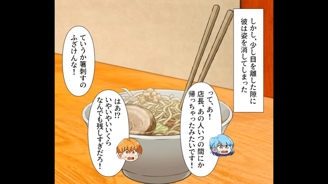 社員がなかなかラーメンを食べ終えないため、主人公たちは心配していました。 そして主人公が目を離した隙に、社員が姿を消してしまい…。
