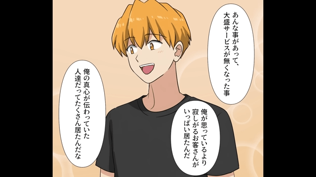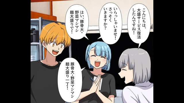 社員とのトラブルが解決したあと、大盛無料サービスを再開した主人公。 店員は主人公に「心を込めて提供しているラーメンなんですから、伝わらないはずありません!」と言い、主人公は「ありがとう。これからもよろしくな」と店員に伝えたのでした。