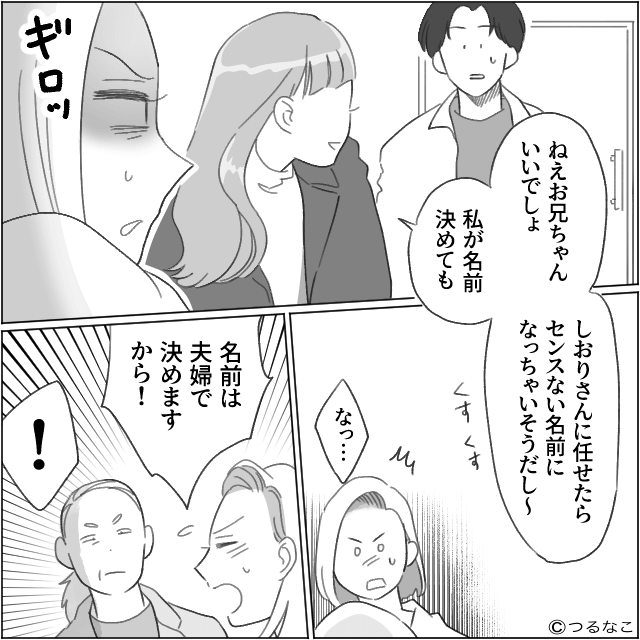 出産後、病室にやってきた夫と義家族。 すると義妹は「私が名前決めてあげる〜」ととんでもないことを言い出します。