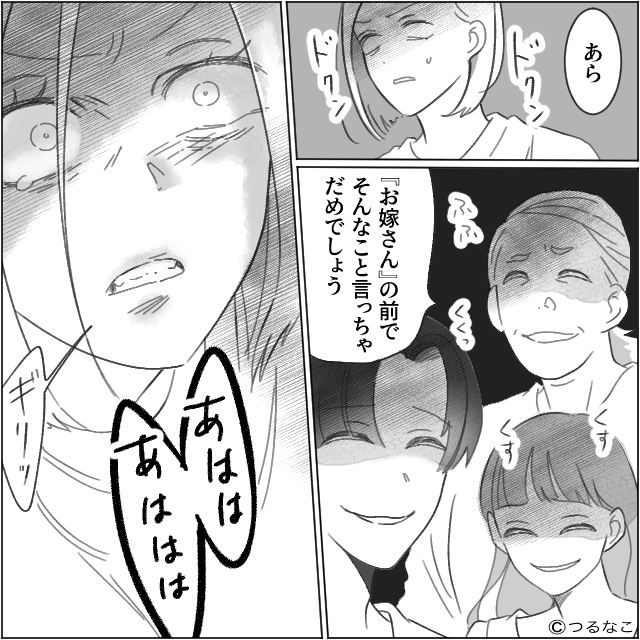 ある日家にやってきた義母と義妹は、主人公のことを「お嫁さん」と呼び、嫌がらせをしてきました。 そして夫も「お前が我慢してれば平和なんだから」と言います。