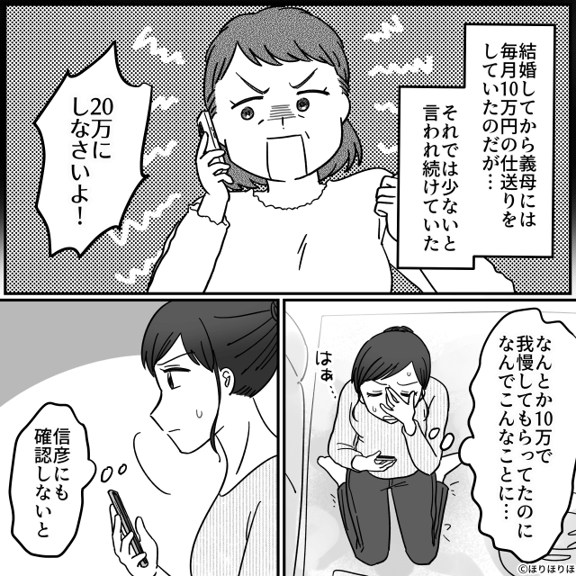 主人公が毎月10万円の仕送りをしているにもかかわらず、額を上げろと文句を言ってくる義母。 義母は20万円の仕送りを求め「今回15万送れるなら20万にもできるでしょ!」と怒鳴ってきます。