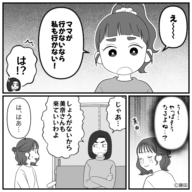 仲間外れにされたことに気づいたものの、義実家に行かなくてよくなり喜んだ主人公。 しかし夫が1人で娘の面倒を見られる自信がないと言ったことと、娘が「ママが行かないなら私も行かない!」と言い出したことで、主人公も義実家に行くことになります。