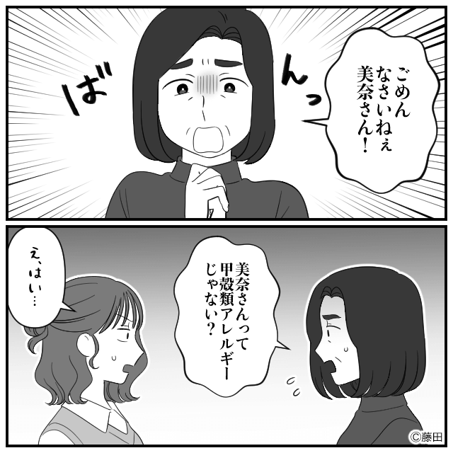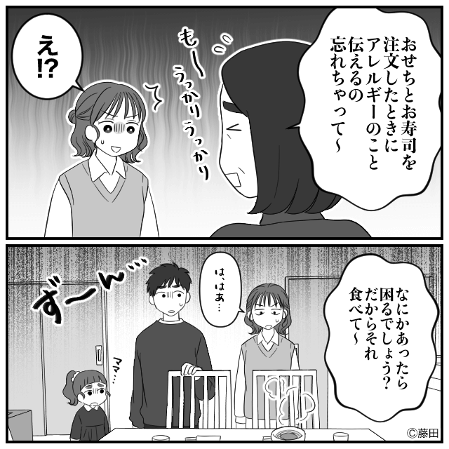 主人公には甲殻類アレルギーがあるのですが、義母はおせちの注文時にアレルギーのことを伝え忘れていたようで…。