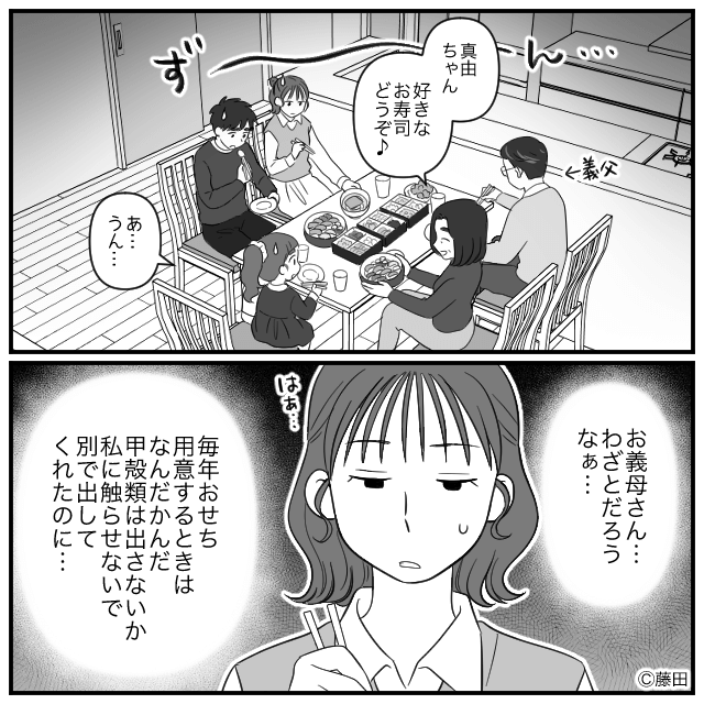 今回は『「自分の実家に帰ったら?」帰省で嫁だけハブる義母の末路』を紹介します。 おせちを注文したものの、主人公のアレルギーを伝え忘れていたと話す義母。 そして義母は主人公にだけ、うどんを出してきたのでした。