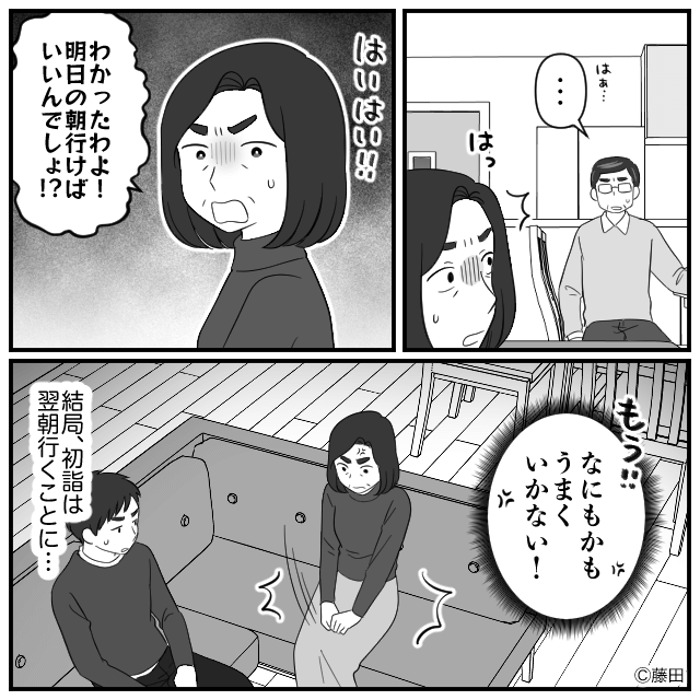 深夜、年が明けた瞬間に「今から初詣行くわよ!」と言い出した義母。 しかし主人公にも夫にも拒否され、義母は「明日の朝行けばいいんでしょ!?」とイライラします。