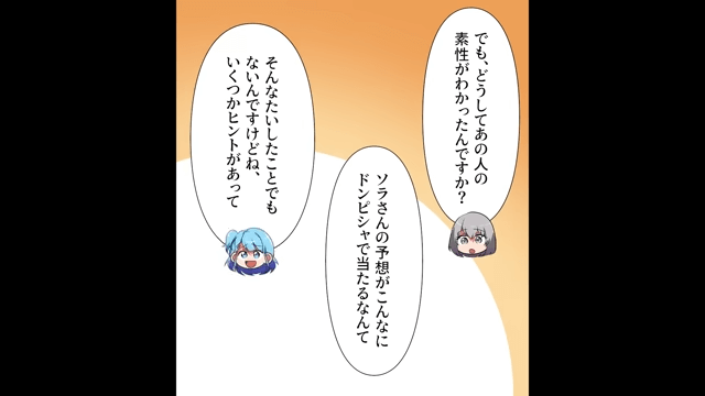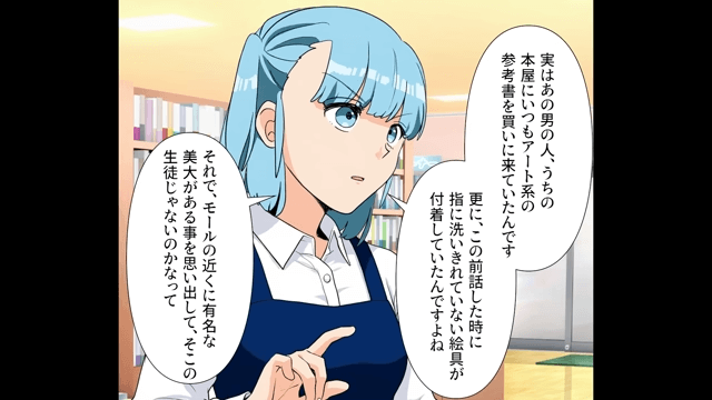 女性は笑顔で書店にやってきて、主人公のおかげで男性が警察に捕まったと話しました。 そして女性が主人公に「どうしてあの人の素性がわかったんですか?」と尋ねると、主人公は自分の推理を説明したのです。