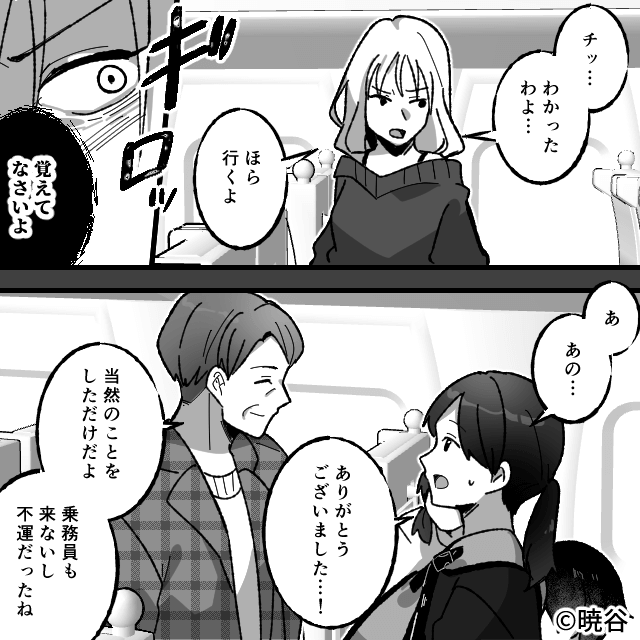男性が「無賃乗車で乗務員を呼ぶか?」と言うと女性は渋々チケットを見せたのですが、そのチケットは自由席のものでした。 女性は男性に叱られ、主人公を睨みながら自由席に移動。