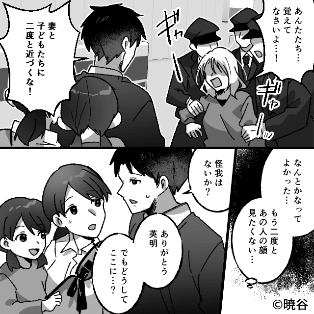 駅に着いた瞬間、走ってやってきた女性につかまれた主人公。 しかし「その手を放せ!」と夫が助けてくれます。