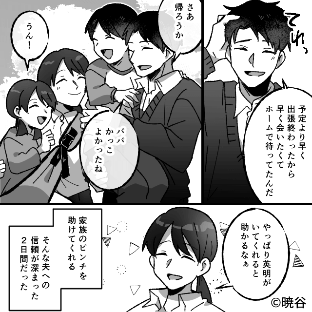 その後、女性は駅員に連れて行かれ、主人公は夫への信頼が深まるのでした。