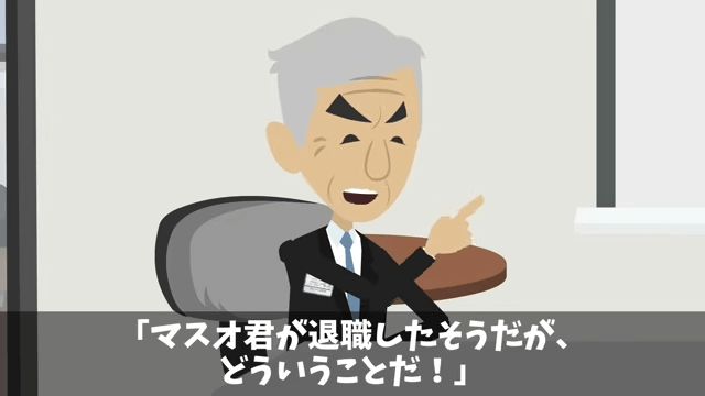会議が始まると、社長が「みんな集まったようだな。大変なことになった!」と話し始めました。 そして社長は主人公が退職したことについて、課長に「どういうことだ!」と詰め寄ります。