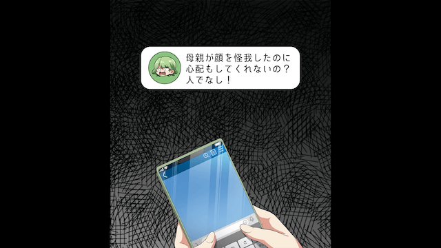 病院に駆けつけた主人公は、母が兄夫婦に迷惑をかけたことを申し訳なく思い、母を引き取ります。 そして翌日、母は主人公や兄夫婦から心配の言葉がないことに不満を抱き「人でなし!」と言ってきたのです。