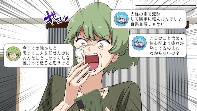 その言葉で堪忍袋の緒が切れた主人公たちは、母を叱責して…。