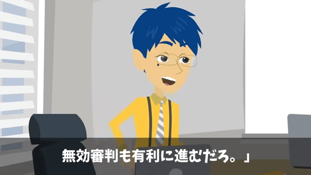社員たちの報告を聞いた課長は「特許無効裁判の準備も順調に進んでるな」と話します。 そして課長が「無効裁判も有利に進むだろ」と言うと、社員が「楽しみですね」と言いました。