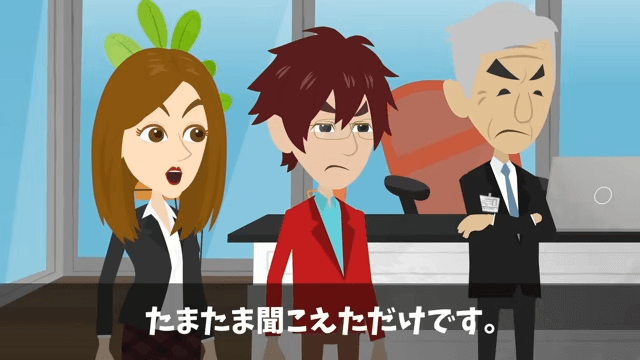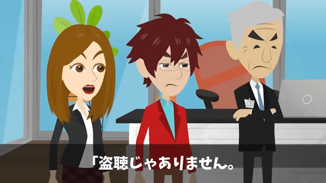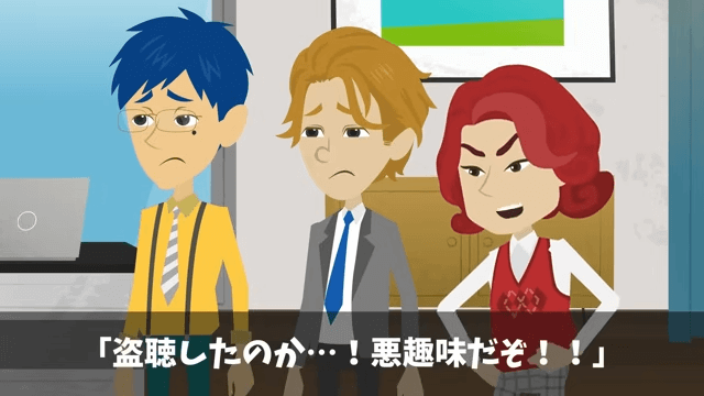 女性社員は課長たちの会話を録音していたことをその場で明かしました。 社員は「盗聴したのか…!悪趣味だぞ!」と怒りますが、女性社員はたまたま聞こえただけだと説明して…。