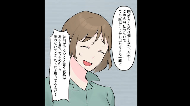 妻は主人公に取り入ろうとするもうまくいかず「あんたが彼を変えたのね!」と彼女を責め始めました。 すると主人公は「そう何度もお前に振り回されてたまるかってんだよ!」と妻に激怒し、妻のせいで店を閉めたことを伝えたのです。