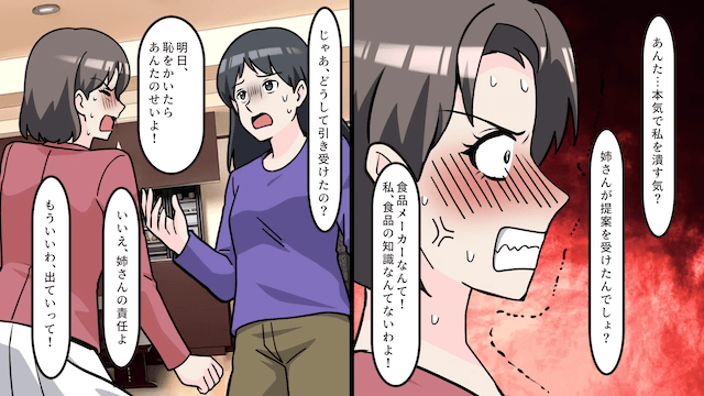 プレゼン前日の夜、姉に呼び出された主人公は姉の家に行きました。 すると姉は「あんた私を陥れようとしてるでしょ」と言い出し、主人公にプレゼンを押しつけようとしてきたのです。