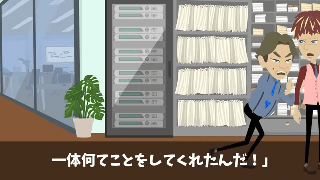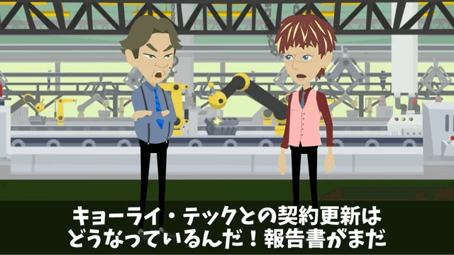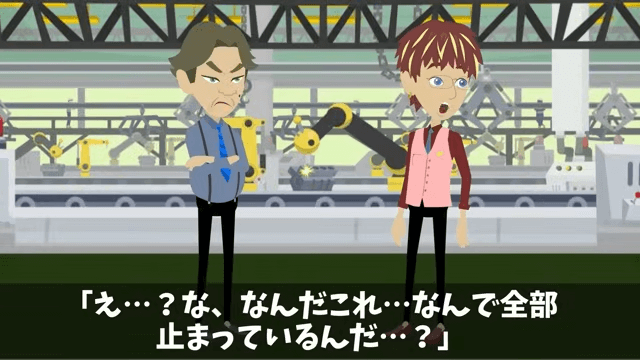 工場に来た課長は「え…?な、なんだこれ…なんで全部止まっているんだ…?」と戸惑います。 そこで部長は、課長が担当していたライセンスの契約更新がどうなっているのか尋ねました。