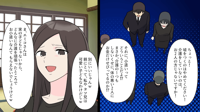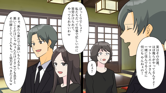 ところが1ヶ月後、義兄と義姉は親戚たちの前で「介護、ほぼ俺らがやってるんすよ!」と嘘をつき始め…。