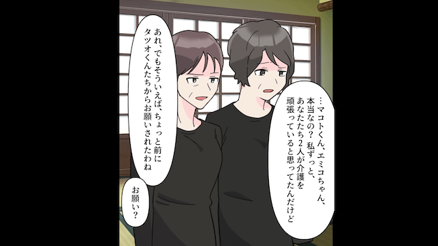 主人公がなにを言っても義兄と義姉は言い訳ばかりで、主人公は2人に介護を手伝う気がないのだと判断します。 そこで主人公が「それで結構ですが、口出しは控えていただけませんか?」と伝えると、2人は反省した様子を見せて謝罪しました。