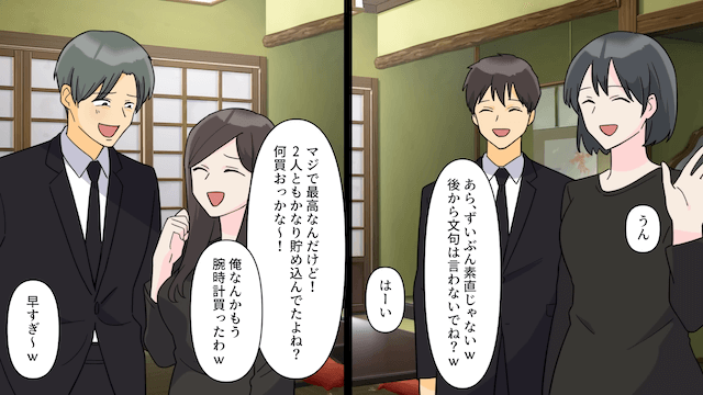主人公夫婦は張り切る2人に遺産のことを任せつつ「計画通り」と笑みを浮かべて…。