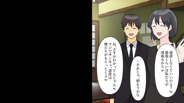 義両親が亡くなり、遺品を整理していた主人公夫婦は遺言書を見つけました。 そして数日後の葬儀の日、義兄と義姉が突然「こっからは俺らの出番だ」と言い、遺産の手続きを買って出たのです。
