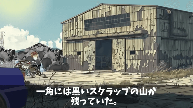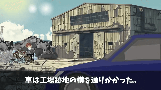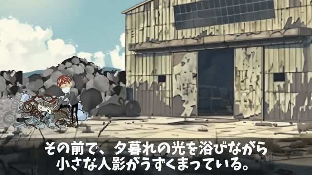 主人公たちが乗った車は、取引先の工場の跡地の横を通りかかりました。 すると黒いスクラップの山の前に小さな人影がうずくまっていて…。