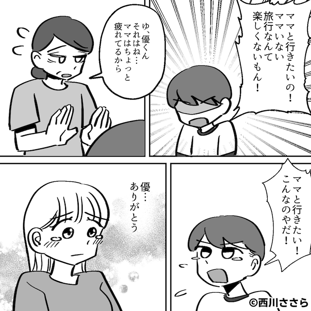 義母が息子にしおりを渡すと、息子は参加者の欄に主人公の名前がないことに気づきます。 そして息子は「ママと行きたい!こんなのやだ!」と涙を流し…。