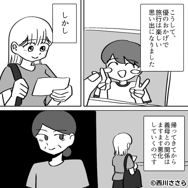 今回は『「塩分で殺す気?」食事のたびに難癖をつける義母』を紹介します。 主人公が旅行に参加しないと知り「ママと行きたい!こんなのやだ!」と泣いた息子。 主人公を仲間外れにしていた義母は、ため息をつきながら「じゃあママも一緒に行きましょう」と言ったのでした。