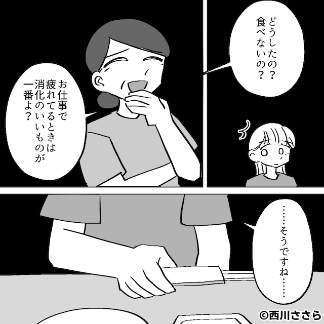 しかし主人公の食事だけは惣菜で、あからさまな嫌がらせに主人公は黙り込むのでした。