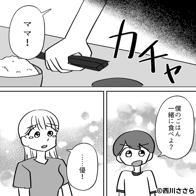 次の日の夕食も主人公だけ冷凍食品だったため、ついに違和感を覚えた息子。 息子は「なんでママだけいつもご飯違うの?」と夫に尋ねるのですが、夫は「俺は知らないかな」と答えます。