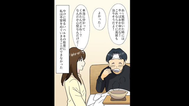 寝込んだ夫が頼ってきたため「私の気持ちわかった?」と告げ、さらに元カノと比較するのをやめてほしいと伝えた主人公。 夫は「わかったよ」と答えましたが、主人公は不安を拭いきれずにいました。