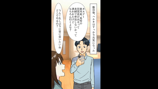 それから数日後、夫から同窓会の知らせを聞いた主人公は、同窓会の会場へ向かったのですが…。