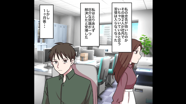苦情を入れた社員を突き止めようとする夫と秘書を制止し、誤解を招くような行動を控えるよう強めに忠告した主人公。 その後は2人に関する苦情が入らなくなり、主人公はホッとしていたのですが…。