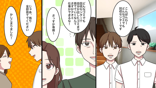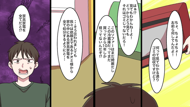 主人公が電話をかけるとすぐに引越し業者が到着し、主人公の荷物を手際よく運び出しました。 続いてゴミの回収業者もやってきて、家具家電を次々と運び出します。