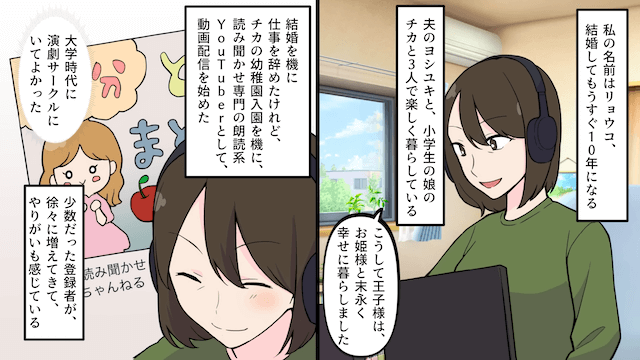 今回は『結婚して10年…夫「運命の人を見つけた!離婚してくれ!」私「まだ会ったことないのに?」⇒お望み通り離婚した結果』を紹介します。 夫と小学生の娘と楽しく暮らしている主人公。 そんな主人公は、朗読系の動画配信をしていて…。