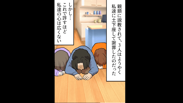 義妹は義弟に、夫は義父に、そして姪は義母にそれぞれ説教をされ、反省した3人は主人公と娘に土下座をして謝罪しました。 しかし3人を許す気がない主人公と娘は、不満を書いた原稿用紙や迷惑行為をまとめた動画を持ってきて…。