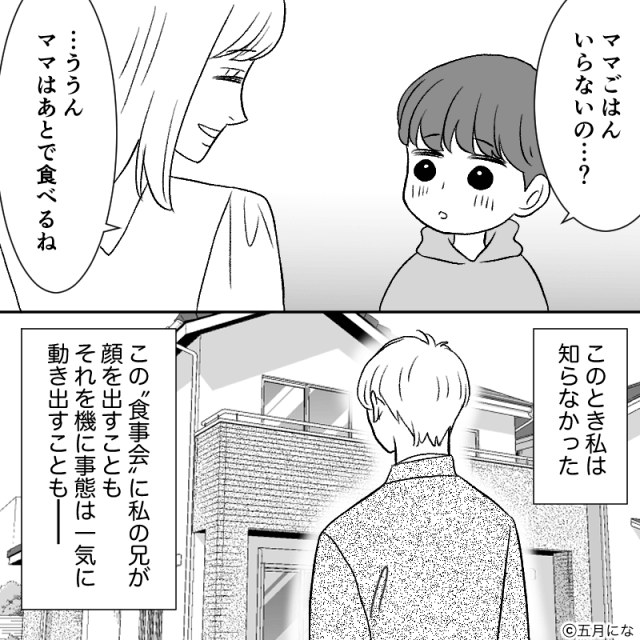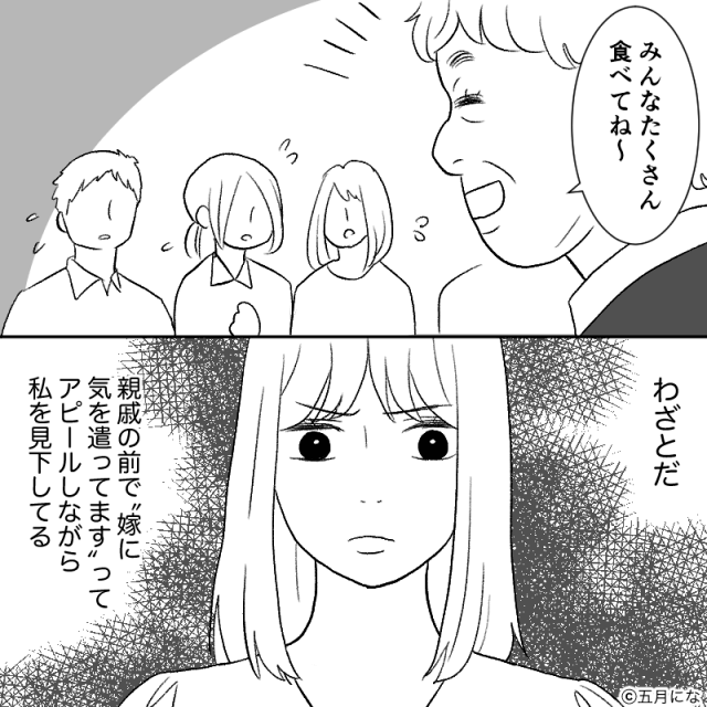親戚を集めて、食事会をしたときのこと。 義母は主人公が作った食事を自分が作ったと紹介し、主人公には冷凍食品を勧めました。